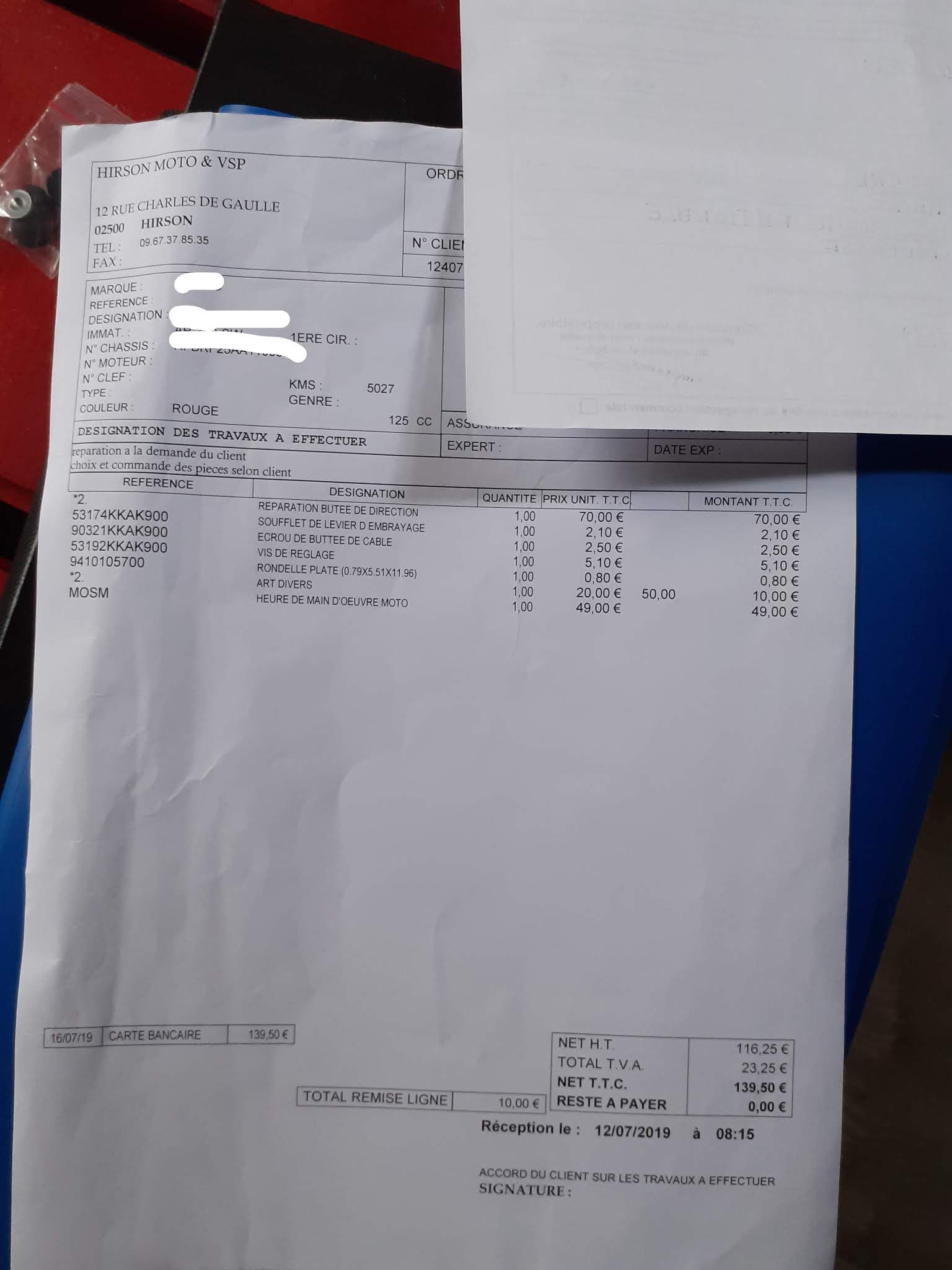 Dommage que je ne puise pas mettre zéro, surnote les devis (600 euros) ma moto en vaut 800 euros j'ai fait un devis suite a une moto accidenté pour qu'il regarde ce qu'il faut changer les 600 euros il mon compter des bricole qu'il n'éter pas a changer... du coup j'ai sélectionner sur le devis les bricole qui éter vraiment a changer est qui eter vraiment pour la securité au finale sa ma coûter 139euros...je vais la rechercher au bout d'un moi est demi encore la c'est fort...est surprise en reprenant ma moto je fait 20 kilomètre plus de frein avant est la je découvre mon étrier entier devisé qui pendé a savoir qu'il mon refait ma butée de direction...j'ai eu de la chance de ne pas passer a l'avant de ma moto, je pose ce commentaire car a mon sens ce son des amateur a fuir qui devrait ce mettre a la réparation de vélo plutôt, aller voir des professionnelle c'est beaucoup mieux... je vous joint une photos de mon devis finale pour pas dire que ji suis jamais aller est que je suis juste un rageux le devis de 600 euros a éter garder par eux...